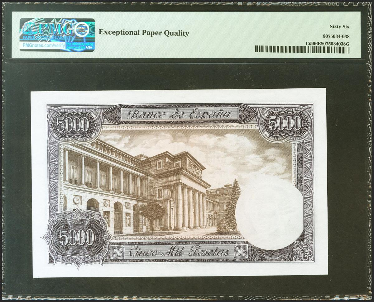 5000 Pesetas. 6 de Febrero de 1976. Serie R. (Edifil 2021: 475a, Pick: 155). Inusual en esta excepcional calidad, apresto original. SC. Encapsulado PMG66EPQ.