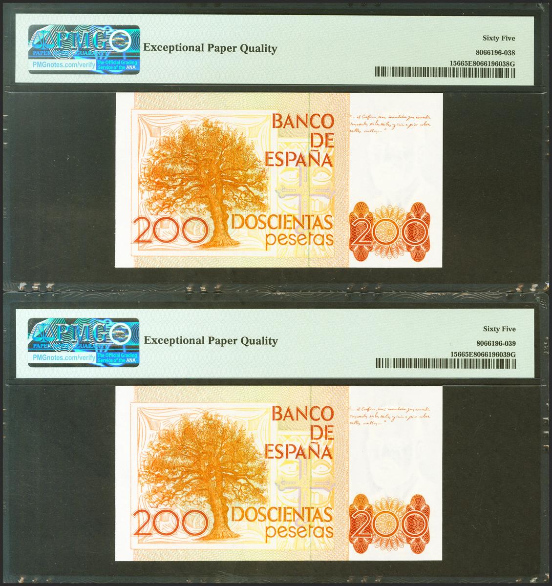 200 Pesetas. 16 de Septiembre de 1980. Pareja correlativa. Sin serie. (Edifil 2021: 480, Pick: 156). Apresto original. SC. Encapsulados PMG65EPQ, ambos.