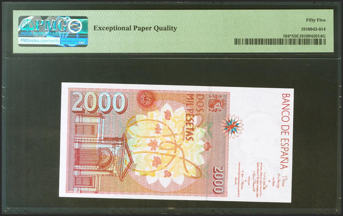 2000 Pesetas. 24 de Abril de 1992. Serie especial 9B. (Edifil 2021: 482Ab, Pick: 164*). Raro en esta calidad, apresto original. SC. Encapsulado PMG65EPQ.
