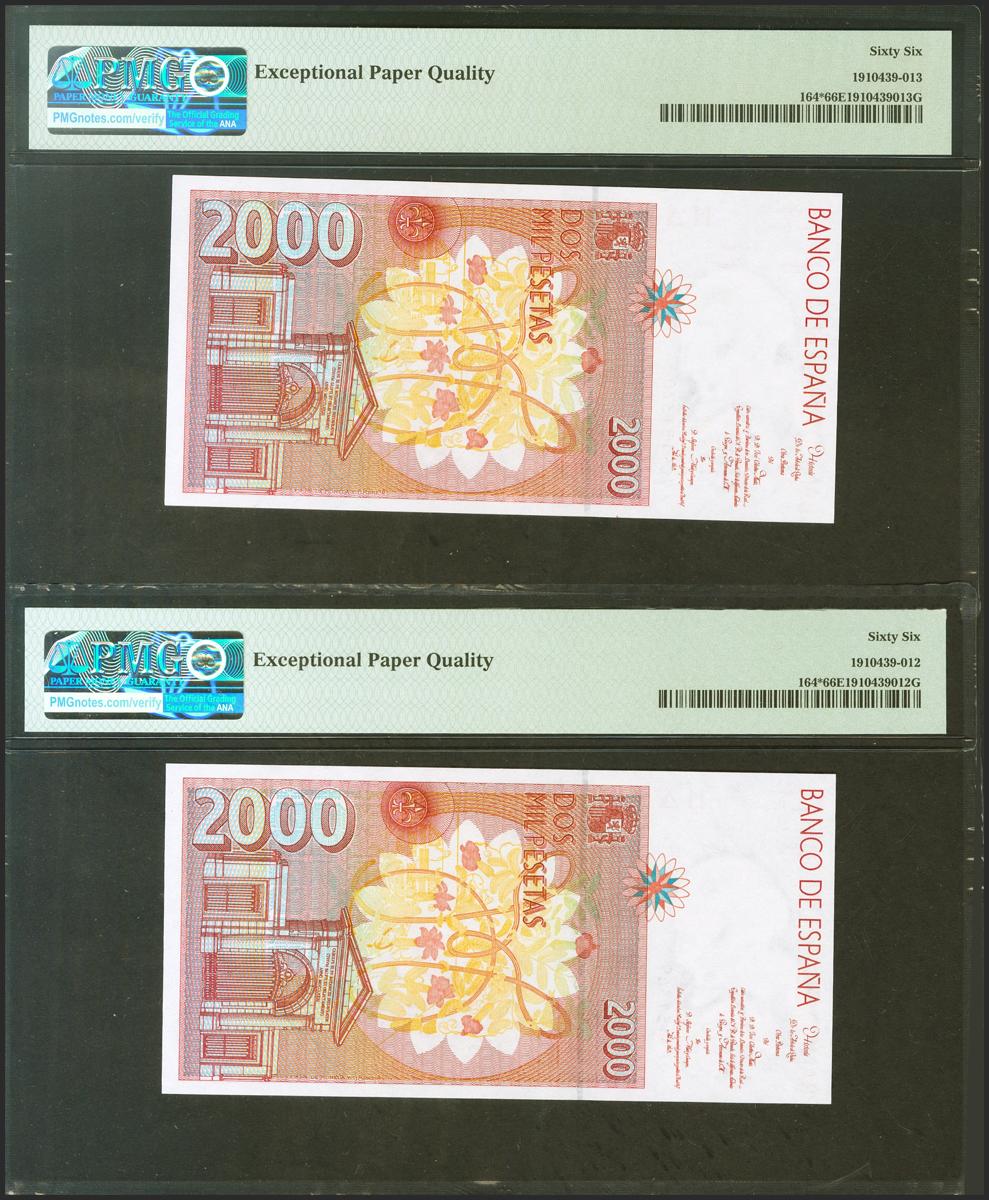 2000 Pesetas. 24 de Abril de 1992. Pareja correlativa. Serie especial 9C. (Edifil 2021: 482Ab, Pick: 164*). Rara en esta excepcional calidad, apresto original. SC. Encapsulado PMG66EPQ, ambos.