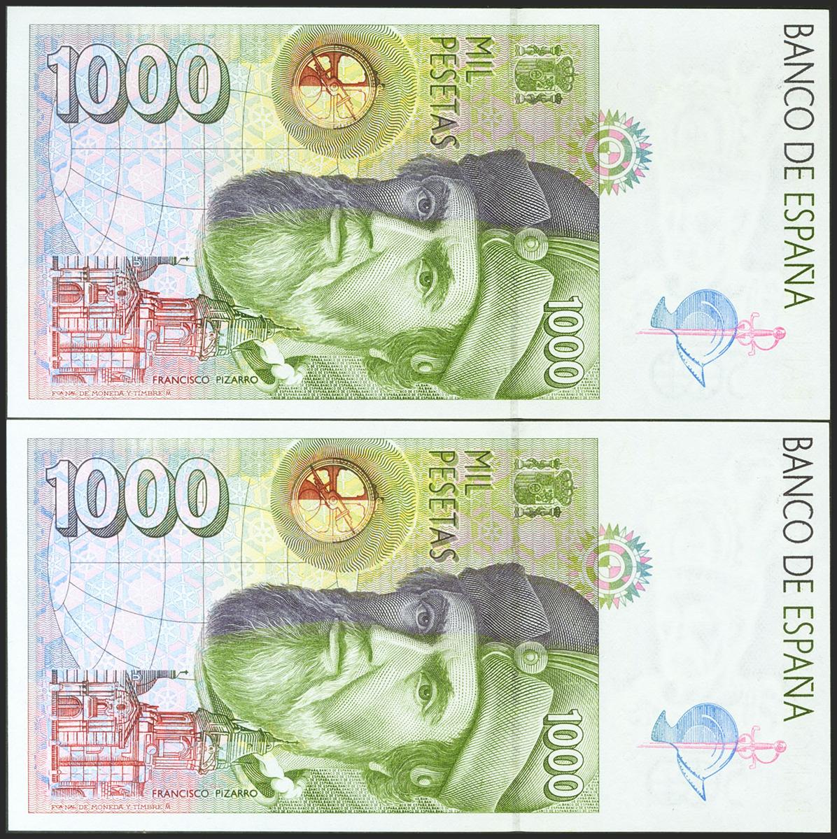 Conjunto de 2 billetes de 1000 Pesetas, emitidos el 12 de Octubre de 1992, sin serie. (Edifil 2021: 483). SC.