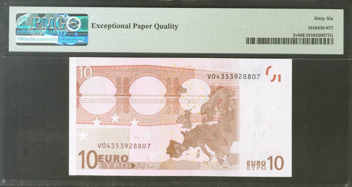 10 Euros. 1 de Enero de 2002. Firma Duisenberg. Serie V (España). (Edifil 2021: 487, Pick: 2v). Raro por la numeración que se encuentra en la estrella del billete (M001F3). SC. Encapsulado PMG66EPQ.