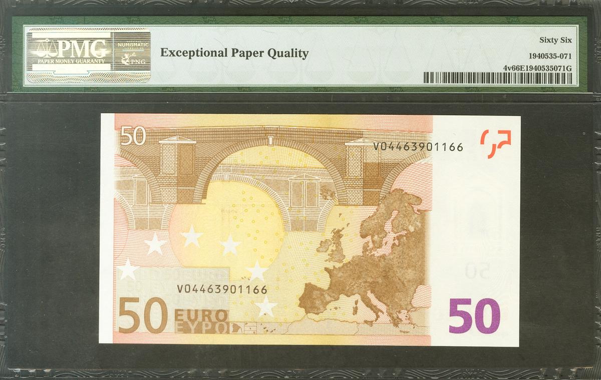 50 Euros. 1 de Enero de 2002. Firma Duisenberg. Serie V (España). (Edifil 2021: 489, Pick: 4v). SC. Encapsulado PMG66EPQ.