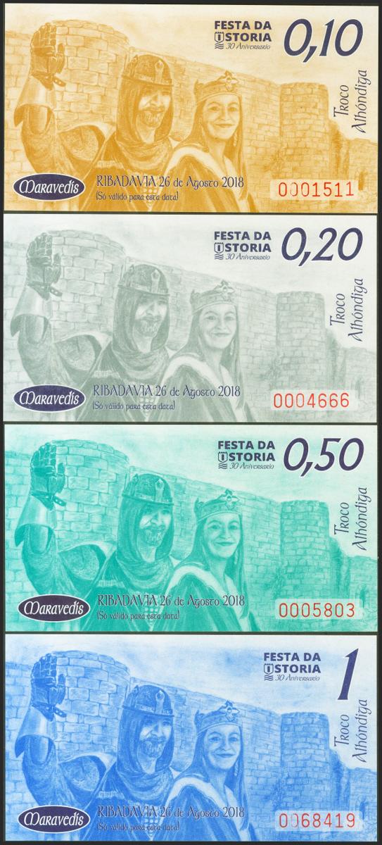 0´10, 0´20, 0´50 y 1 Maravedís (entendemos que se tratan del juego completo). 26 de Agosto de 2018. Billetes relacionados con la Festa da Istoria 2018 de Ribadavia, numerados. Curiosos. SC.