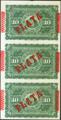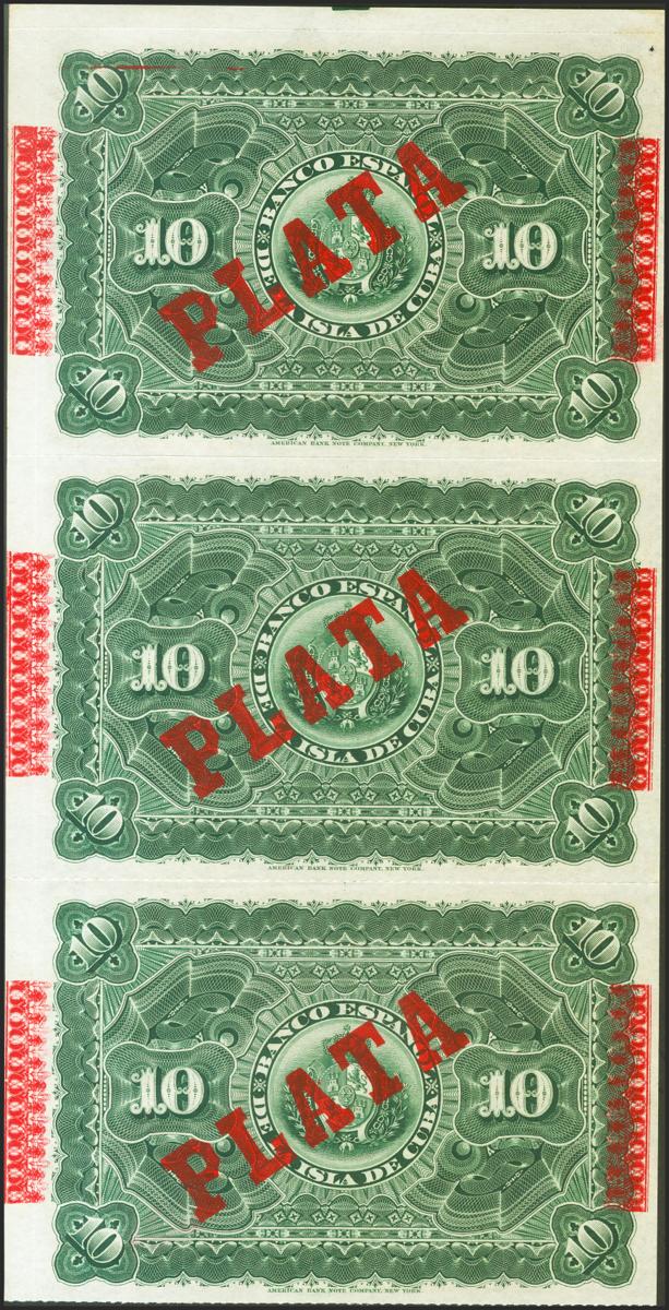 BANCO ESPAÑOL DE LA ISLA DE CUBA. Conjunto de 3 billetes correlativos de 10 Pesos (sin desprender), emitidos el 15 de Mayo de 1896 con sobrecarga PLATA, al dorso. (Edifil 2021: 82). Apresto original, un billete punto de aguja, no se trata de un defecto, sino que todos los billetes de esa posición lo tienen debido al sistema de impresión. SC.