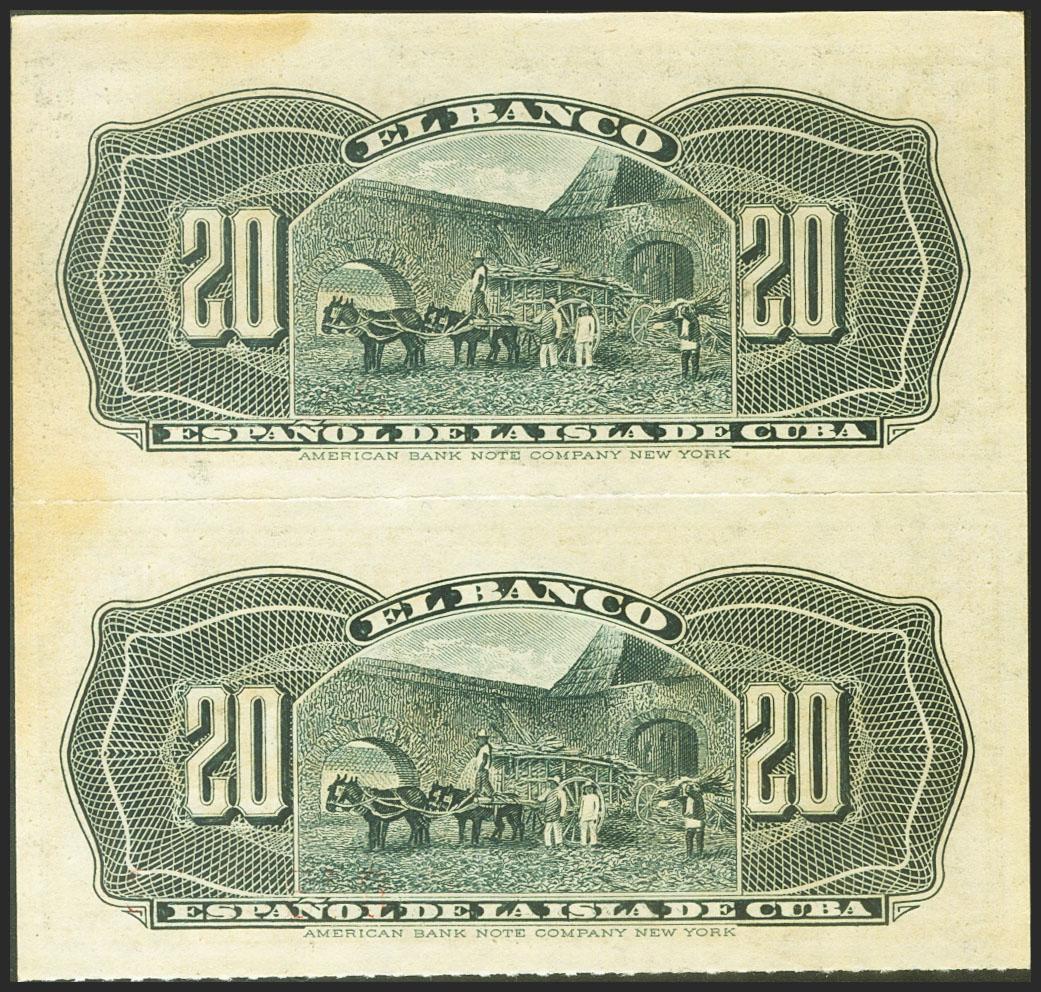 BANCO ESPAÑOL DE LA ISLA DE CUBA. Conjunto de 2 billetes correlativos de 20 Centavos (sin desprender), emitidos el 15 de Febrero de 1897 (Edifil 2021: 85). Manchitas de óxido, conservando todo su apresto original. SC-.