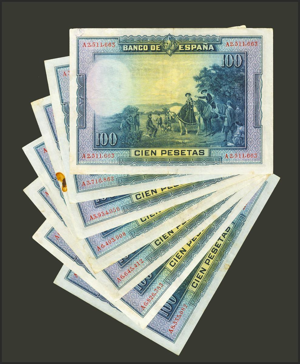 Conjunto de 7 billetes de 100 Pesetas emitidos el 15 de Agosto de 1928, con la serie A. (Edifil 2021: 355a). MBC-/EBC-. A EXAMINAR.