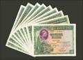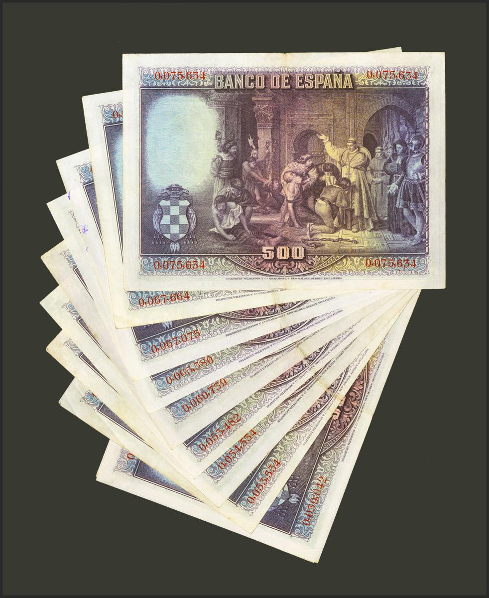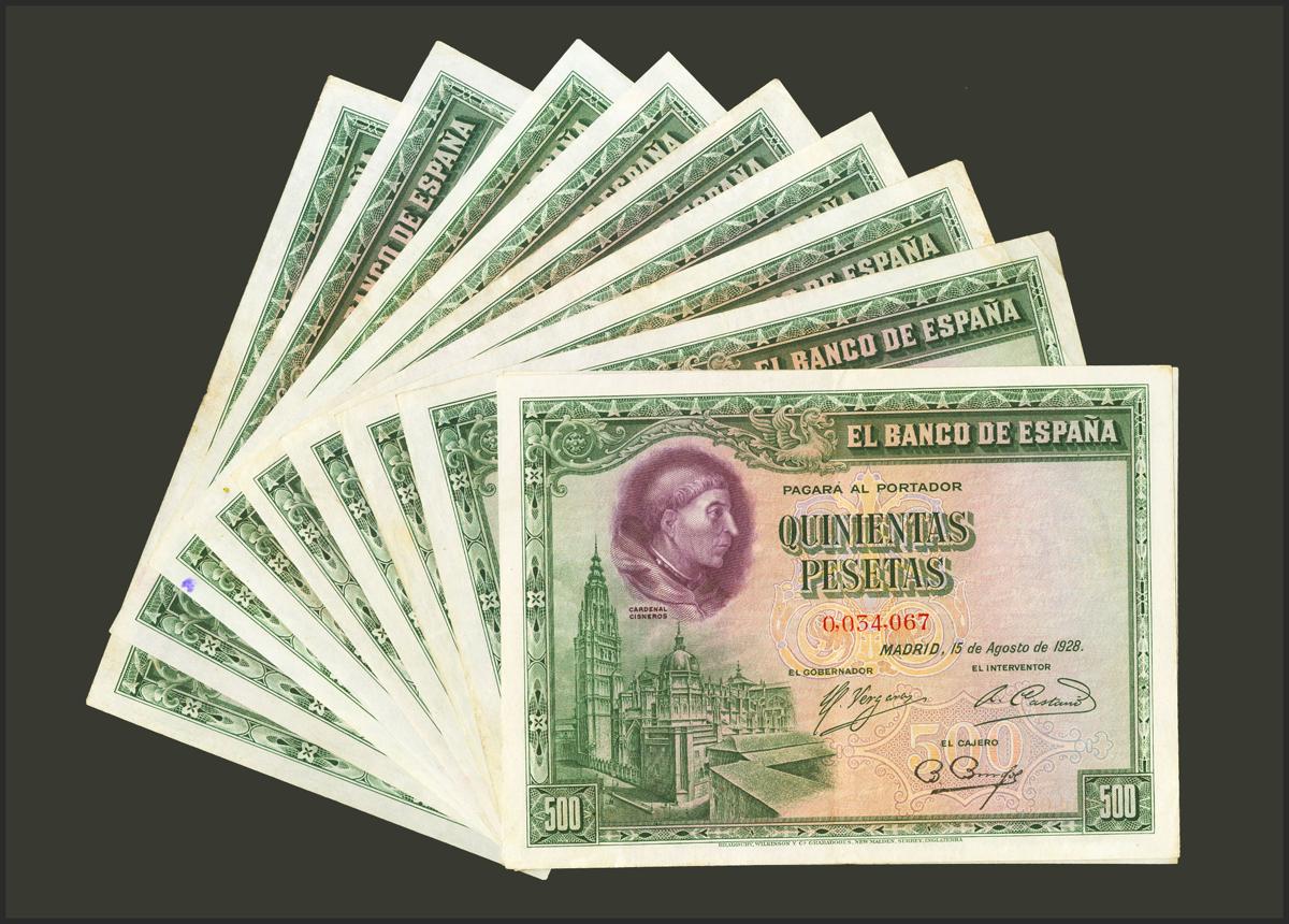 Conjunto de 10 billetes de 500 Pesetas emitidos el 15 de Agosto de 1928, sin serie y todos ellos con numeraciones bajas. (Edifil 2021: 356). A EXAMINAR.