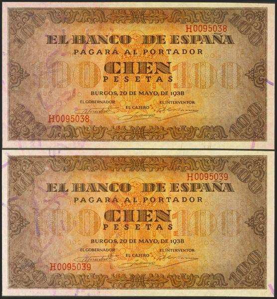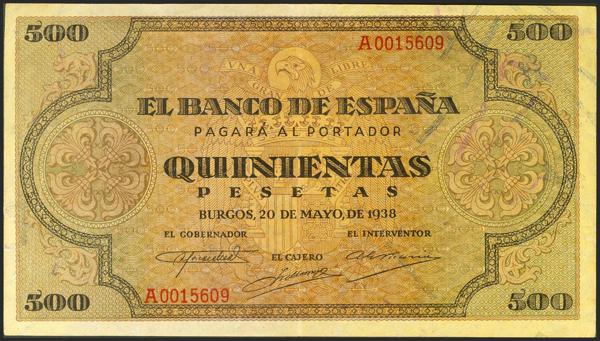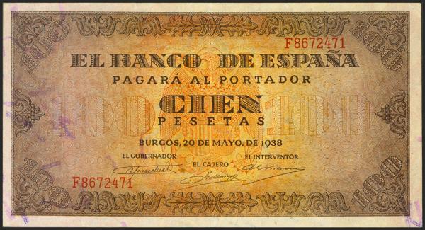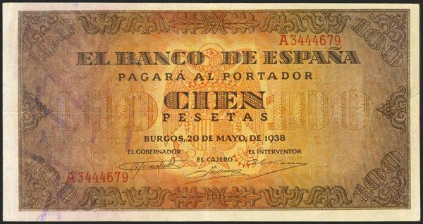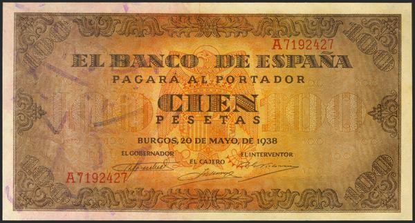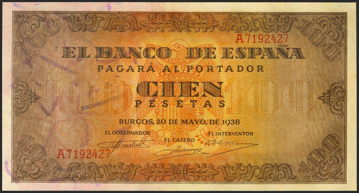 Resulta muy llamativa la denominación empleada en este espécimen, 20 (se supone que pesetas, pero no hay anverso para corroborarlo), una denominación jamás empleada en España, si exceptuamos valores en Céntimos de los sellos-moneda y algunos billetes locales de la Guerra Civil. Tampoco fue una denominación habitual en Italia, utilizada pocas veces en el siglo XIX y una única vez en el siglo XX. Es probable que la justificación de esa cifra se nos escape, aunque cabe elucubrar influencia suiza de los 20 Francos. En todo caso es muy llamativo el fondo acolchado de 100, un grabado con efecto relieve, un tipo de decoración no muy utilizada y que recuerda a las marcas de agua germánicas de la época. El uso abundante de motivos geométricos para el fondo y esa doble coloración nos hablan de trabajos mecánicos más que artísticos, y suponen, probablemente, un ensayo de lo que ejecutarían ya en firme en la emisión de 1940.