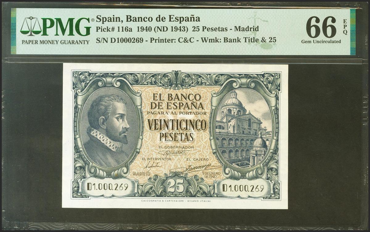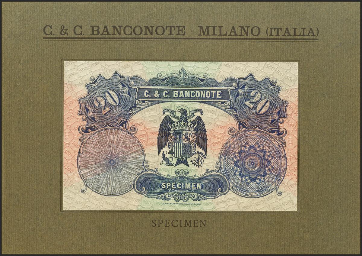 El precioso ejemplar de 20 Pesetas (sobre un fondo de 100 Pesetas) que se ofrece es un fantástico documento de las capacidades técnicas de la imprenta italiana C&C, pues se trata de una prueba completamente impresa de reverso, con unas dimensiones de 17´3 cm x 11 cm, adherido sobre una cartulina de 26´8 cm x 18´2 cm.
