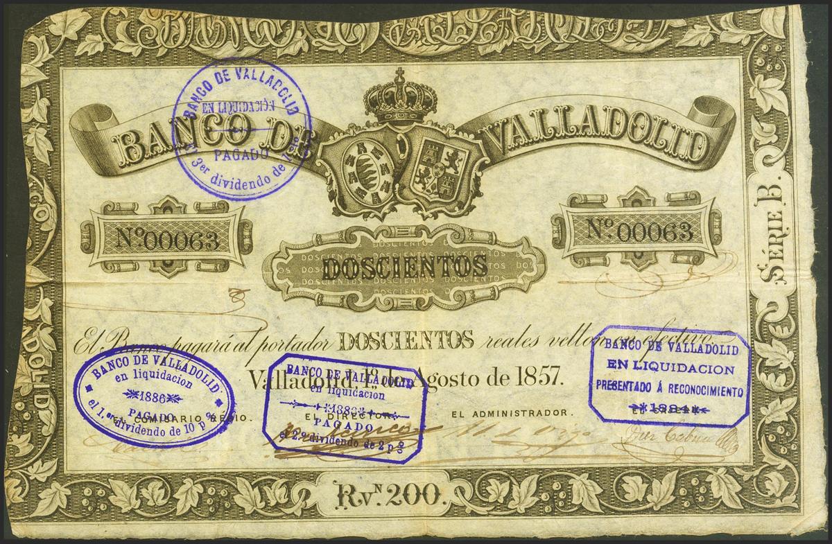 200 Reales de Vellón. 1 de Agosto de 1857. Banco de Valladolid. Serie B. (Edifil 2021: 132). Muy raro. MBC+.