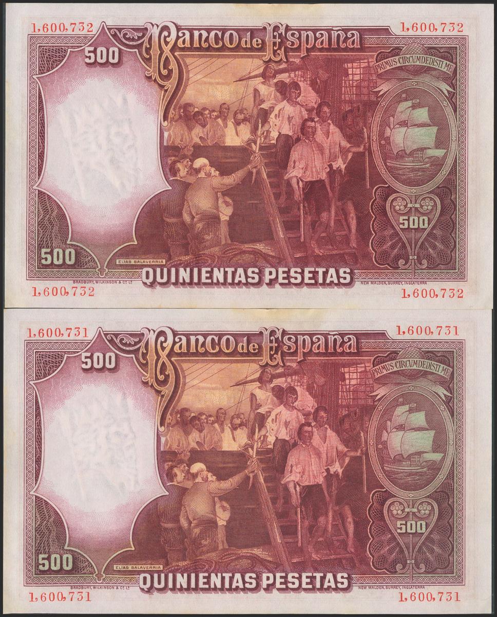 500 Pesetas. 25 de Abril de 1931. Pareja correlativa. Sin serie. (Edifil 2017: 361). Conserva todo su apresto original, manchitas en el margen superior. EBC+.