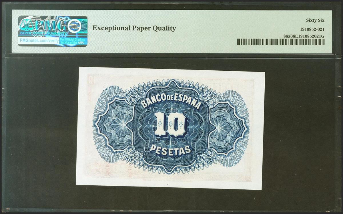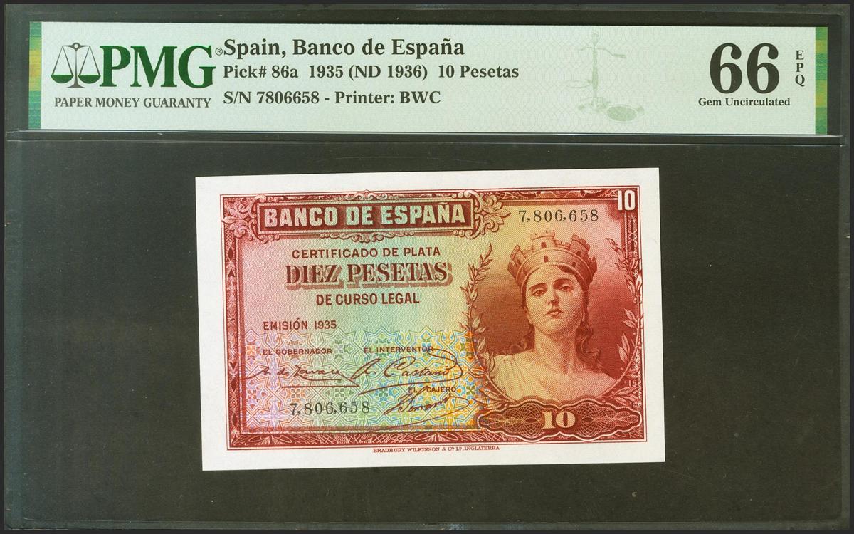 10 Pesetas. 1935. Certificado de Plata. Sin serie. (Edifil 2021: 364, 86a). Inusual en esta excepcional calidad, apresto original. SC. Encapsulado PMG66EPQ.