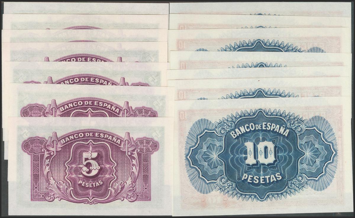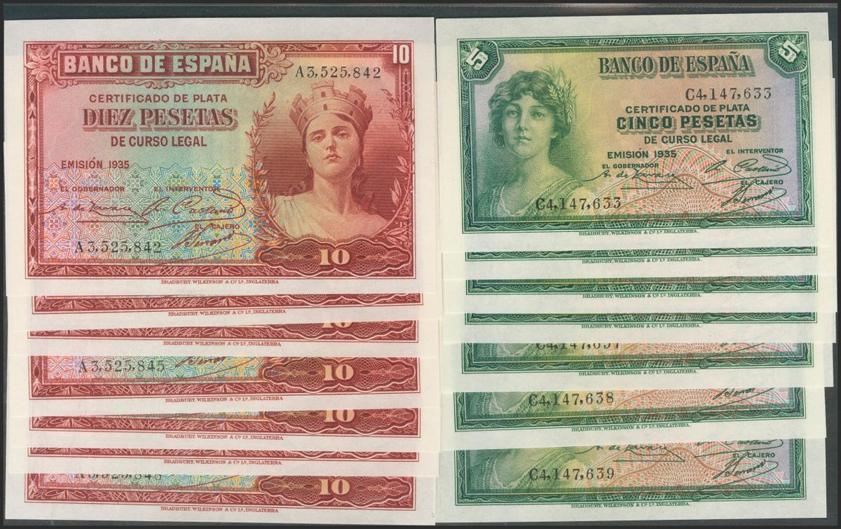 Conjunto de 7 series completas de los billetes correlativos de 5 Pesetas y 10 Pesetas emitidos en 1935, con las series C y A, respectivamente. (Edifil 2017: 363/64a). SC-.