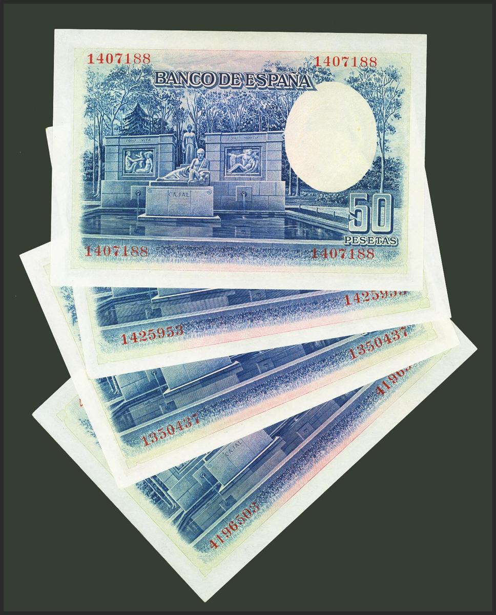Conjunto de 4 billetes de 50 Pesetas emitidos el 22 de Julio de 1935 sin serie (Edifil 2021: 366), conserva todo su apresto original. SC/SC-.