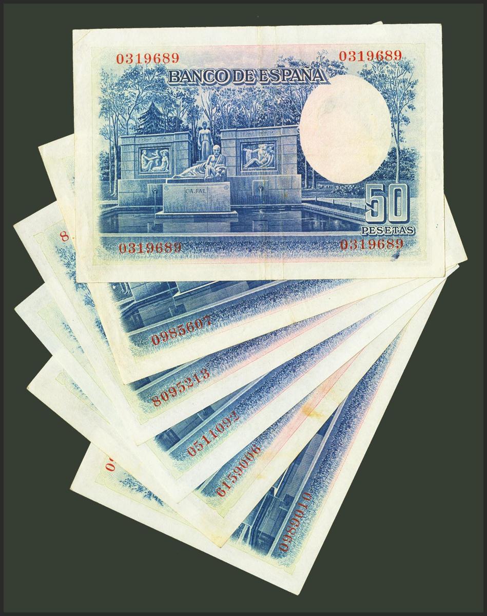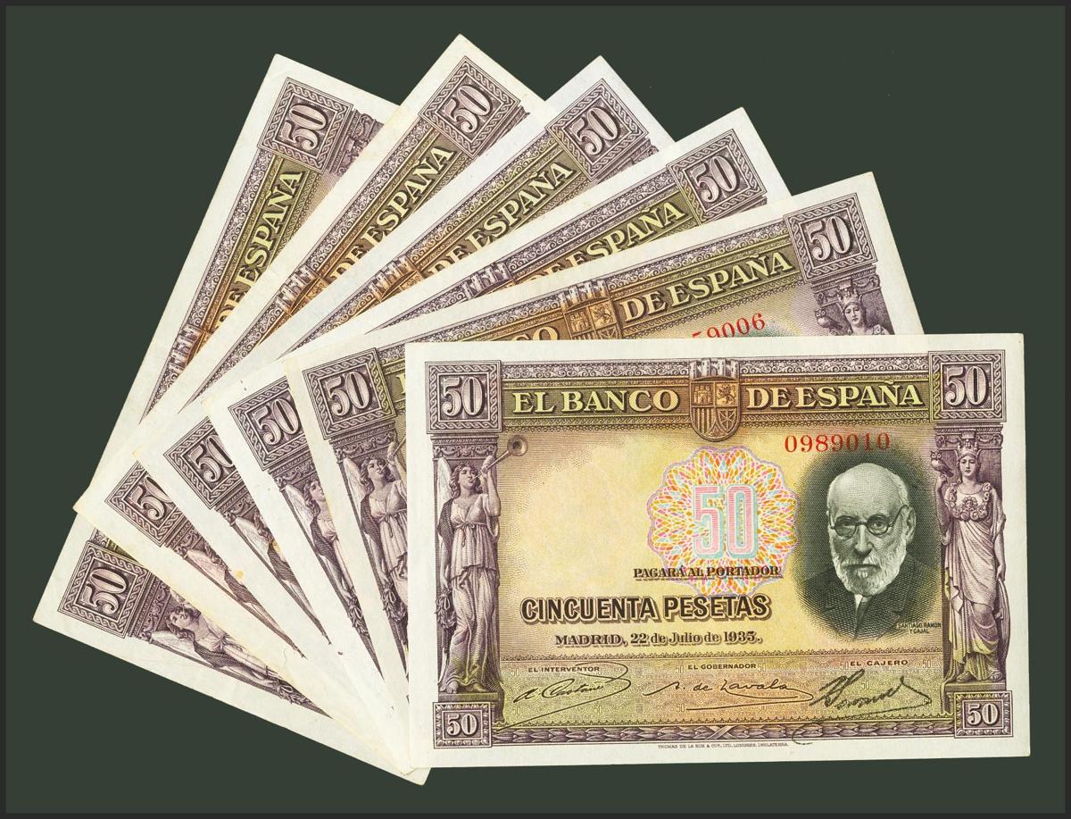 Conjunto de 6 billetes de 50 Pesetas emitidos el 22 de Julio de 1935 sin serie. (Edifil 2021: 366). EBC.