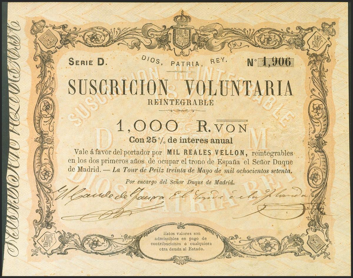 1000 Reales. 30 de Mayo de 1876. Emisión Tour de Peilz. Serie D. (Edifil 2021: 199). Inusual. EBC+.