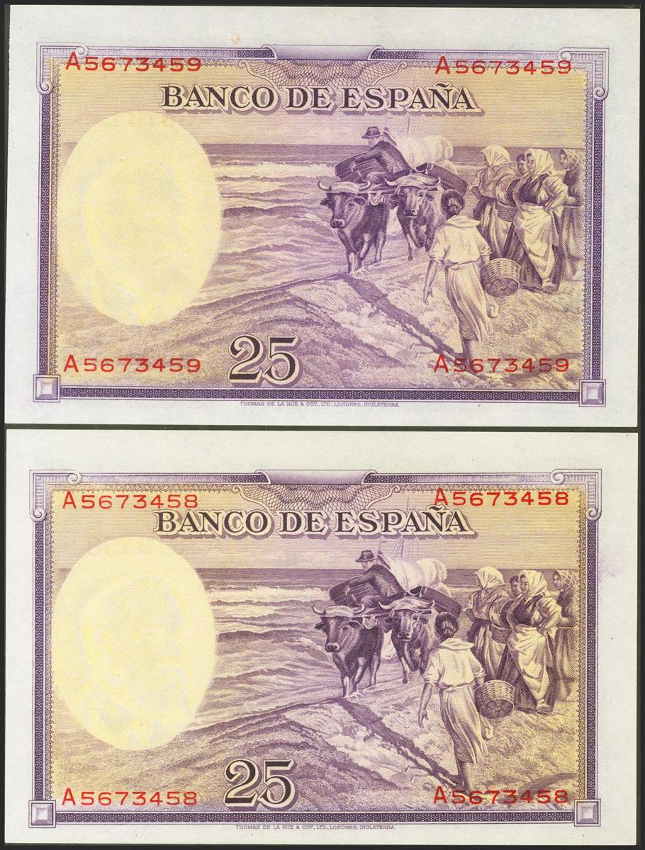 25 Pesetas. 31 de Agosto de 1936. Pareja correlativa. Serie A. (Edifil 2021: 367a). Apresto original. SC.