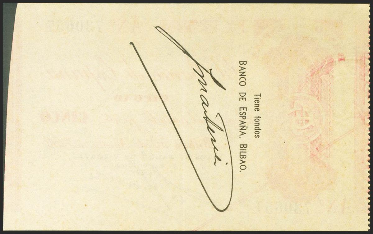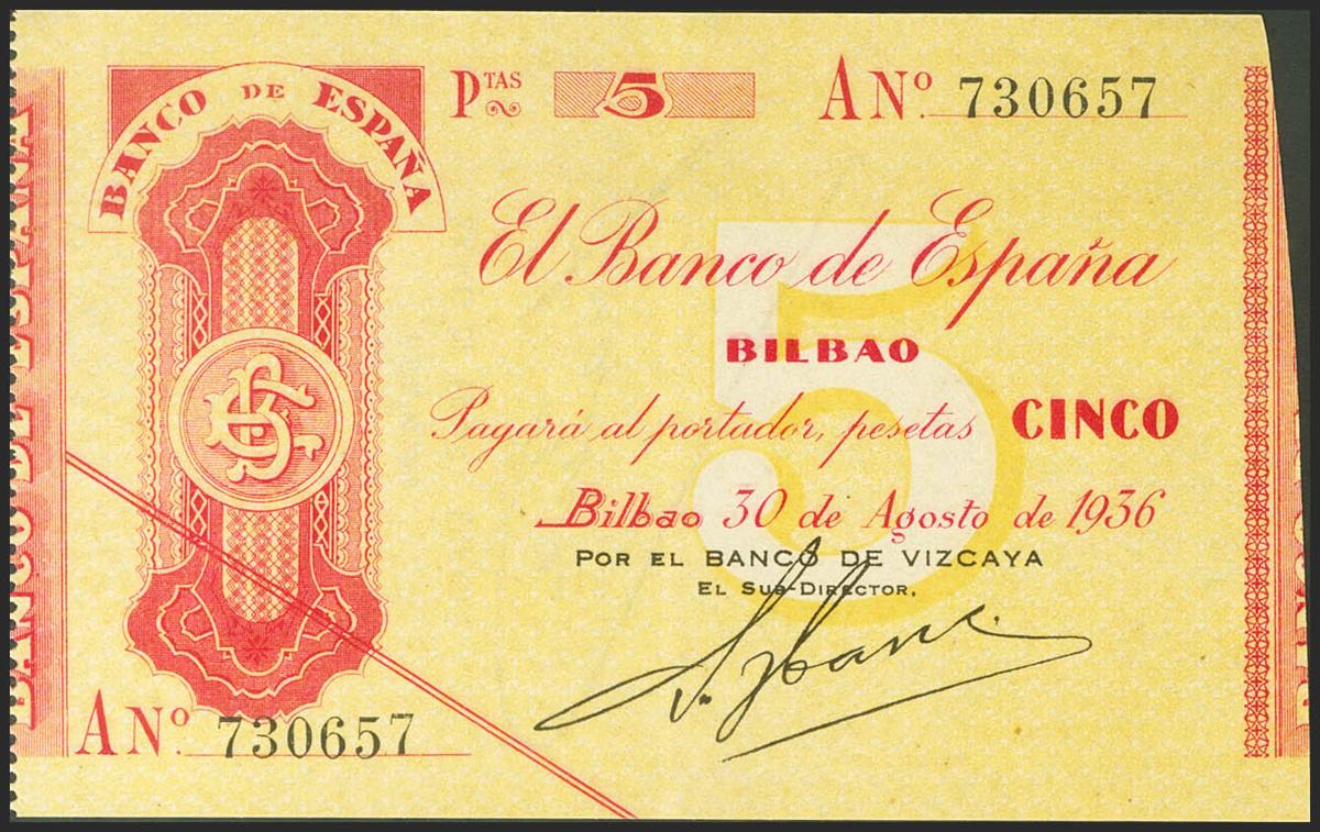 5 Pesetas. 30 de Agosto de 1936. Sucursal de Bilbao, antefirma del Banco de Vizcaya. Serie A. (Edifil 2021: 368Aa). Inusual, apresto original. EBC+.
