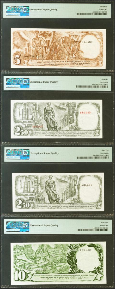 Espectacular conjunto de la serie completa de 4 billetes emitidos el 25 de Septiembre de 1936 por la Generalitat de Catalunya, compuesto por el 2´50 Pesetas (numeración negra), 5 Pesetas y 10 Pesetas. (Edifil 2021: 372, 372a, 373, 374). Extraordinariamente raro conjunto en esta excepcional calidad, conservando su apresto original. Encapsulados 2´50 Pesetas PMG65EPQ, 2´50 Pesetas numeración roja PMG66EPQ, 5 Pesetas 65EPQ y 10 Pesetas 64EPQ.