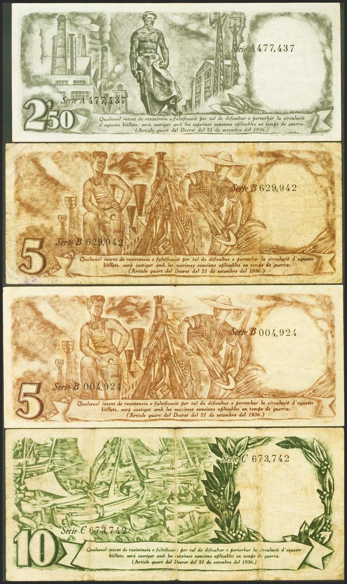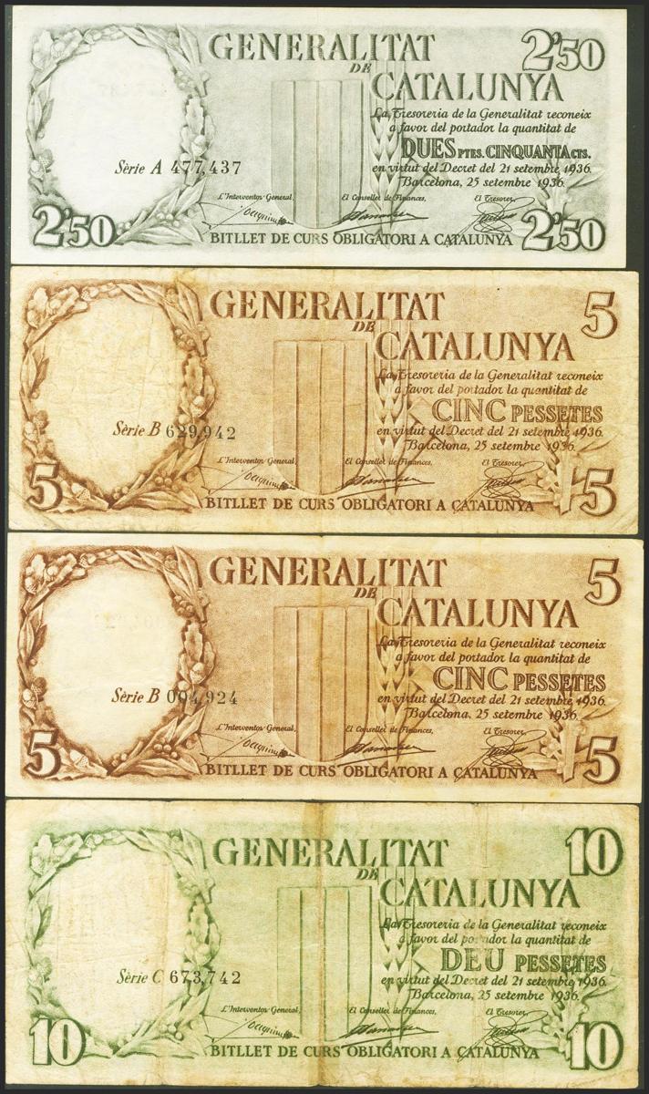 Serie completa de los 4 billetes de la Generalitat de Catalunya a falta del 2´50 Pesetas con la numeración en rojo e incluyendo 2 billetes de 5 Pesetas emitidos el 25 de Septiembre de 1936. (Edifil 2017: 372/74). EBC-/MBC.