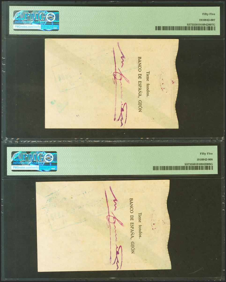 25 Pesetas. 5 de Noviembre de 1936. Sucursal de Gijón. Pareja correlativa. Sin serie. (Edifil 2021: 382, Pick: S573). Muy rara pareja, especialmente en esta excepcional calidad. EBC+.Encapsulados PMG55, ambos. (Para hacernos idea de la rareza, a fecha 1 de Agosto de 2022, esta pareja correlativa es la segunda mejor calificada por PMG).