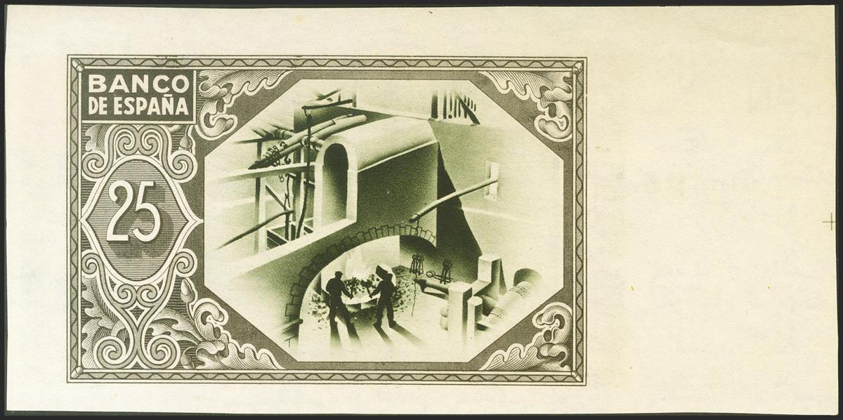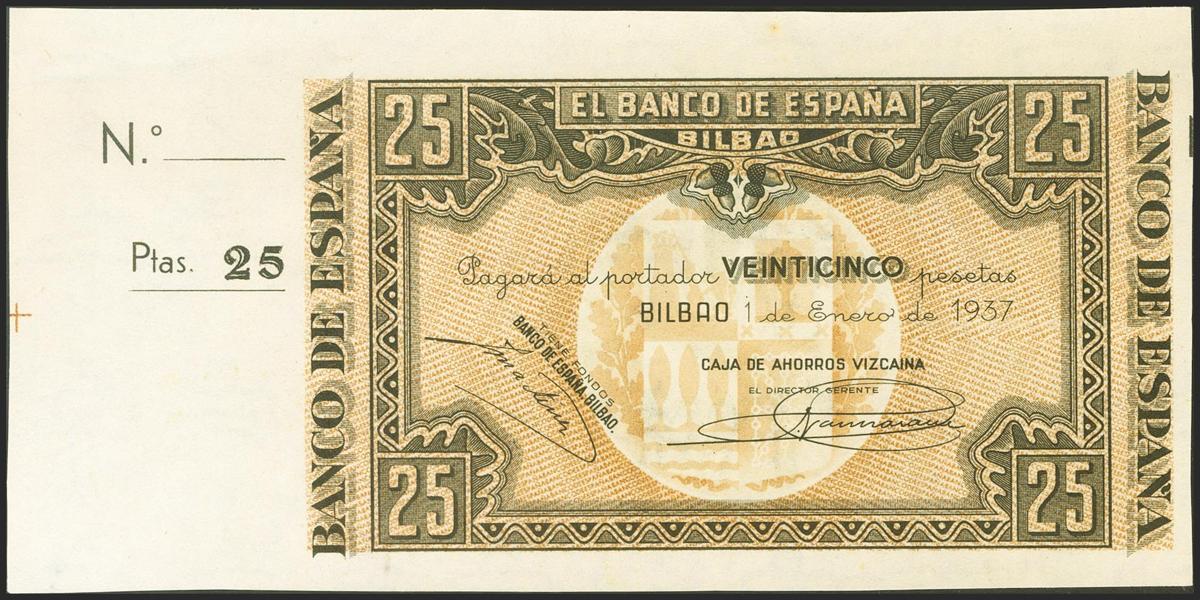 25 Pesetas. 1 de Enero de 1937. Sucursal de Bilbao, antefirma Caja de Ahorros Vizcaína. Sin serie y sin numeración, con la matriz izquierda. (Edifil 2021: 388a). Apresto original. SC-.