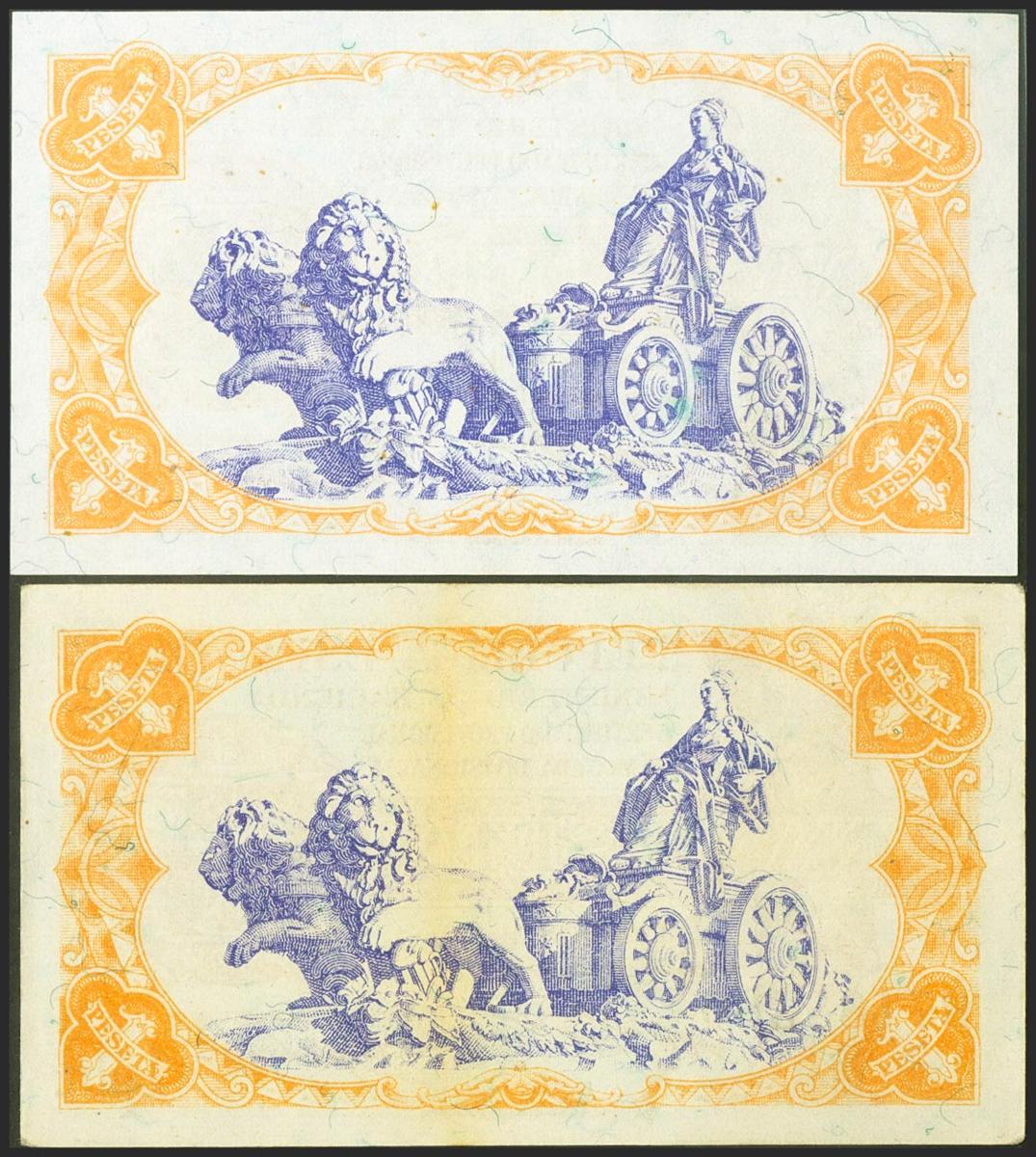 Conjunto de 2 billetes de 1 Peseta Ministerio de Hacienda emitido en 1937 con las series A y B, respectivamente (Edifil 2021: 392). Típicos puntitos y apresto original. SC/SC-.