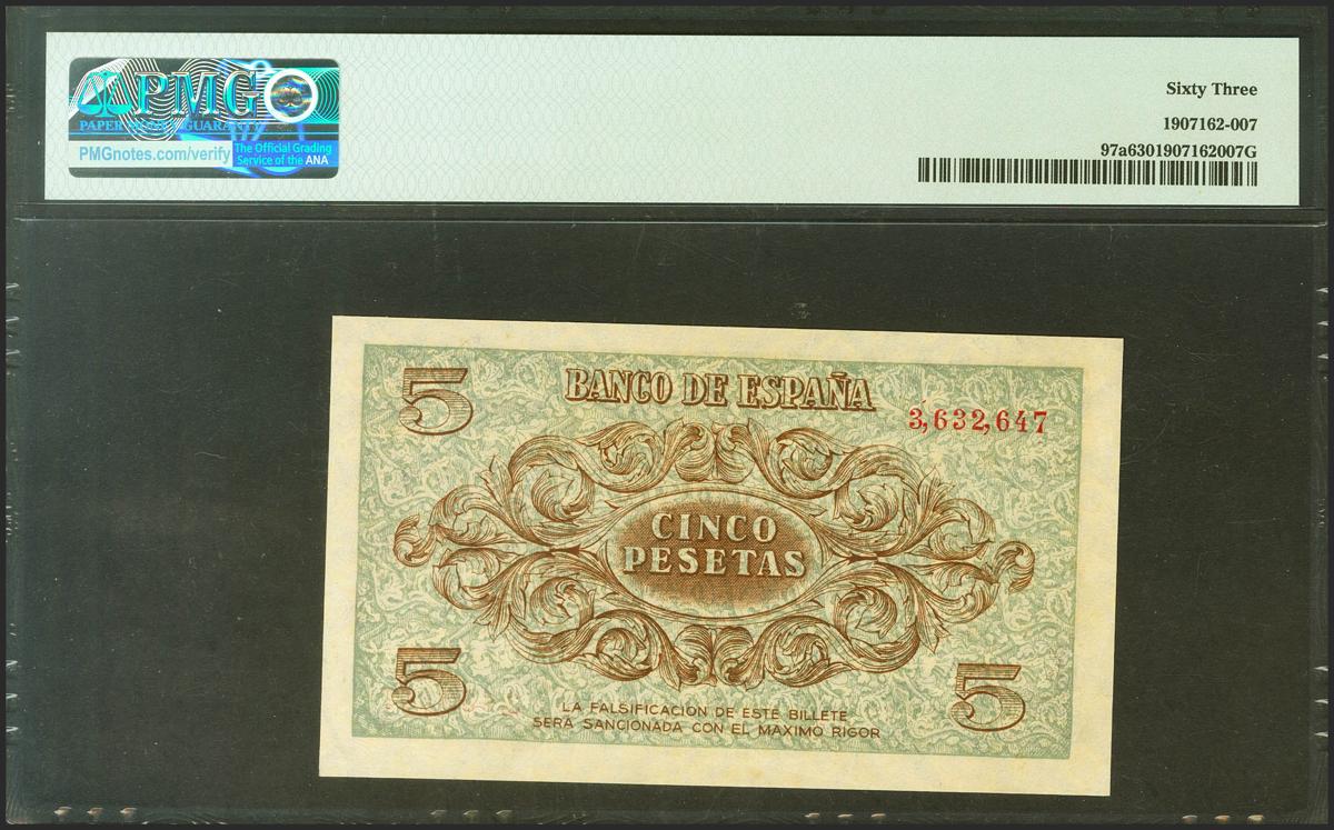 5 Pesetas. 21 de Noviembre de 1936. Sin serie. (Edifil 2021: 417, Pick: 97a). Rarísimo en esta excepcional calidad (para hacerse idea de la rareza de este billete a fecha 1 de Noviembre de 2021 en el registro público en esta calidad PMG le otorga la novena mejor calificación junto a 3 billetes). SC. Encapsulado PMG63.