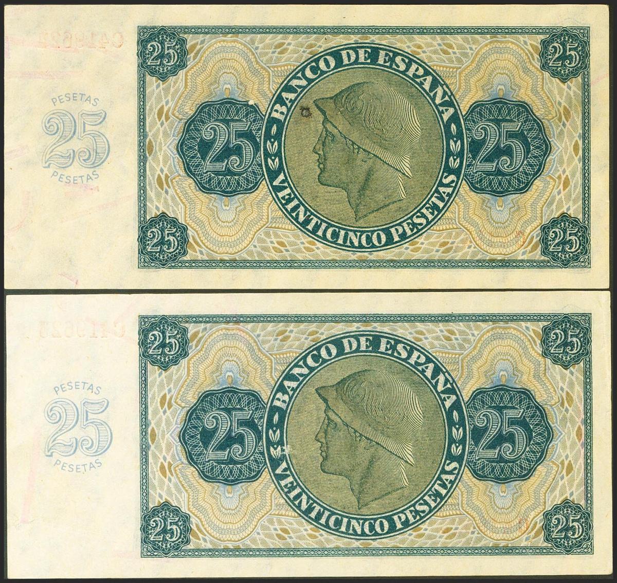 25 Pesetas. 21 de Noviembre de 1936. Pareja correlativa. Serie C. (Edifil 2021: 419a). Conserva todo su apresto original. EBC++/SC--.