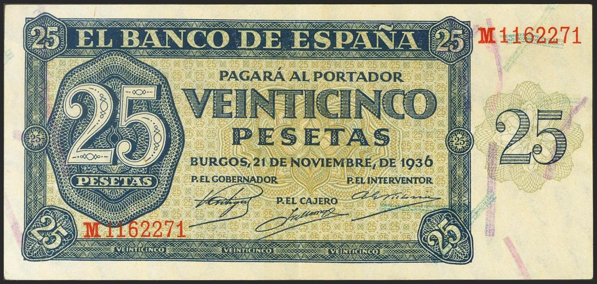 25 Pesetas. 21 de Noviembre de 1936. Serie M. (Edifil 2021: 419a). Conserva algo de su apresto orginal. EBC.
