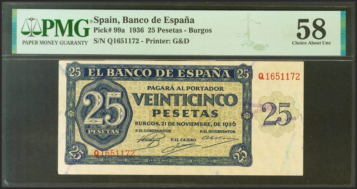 25 Pesetas. 21 de Noviembre de 1936. Serie Q. (Edifil 2021: 419a, Pick: 99a). EBC++. Encapsulado PMG58.