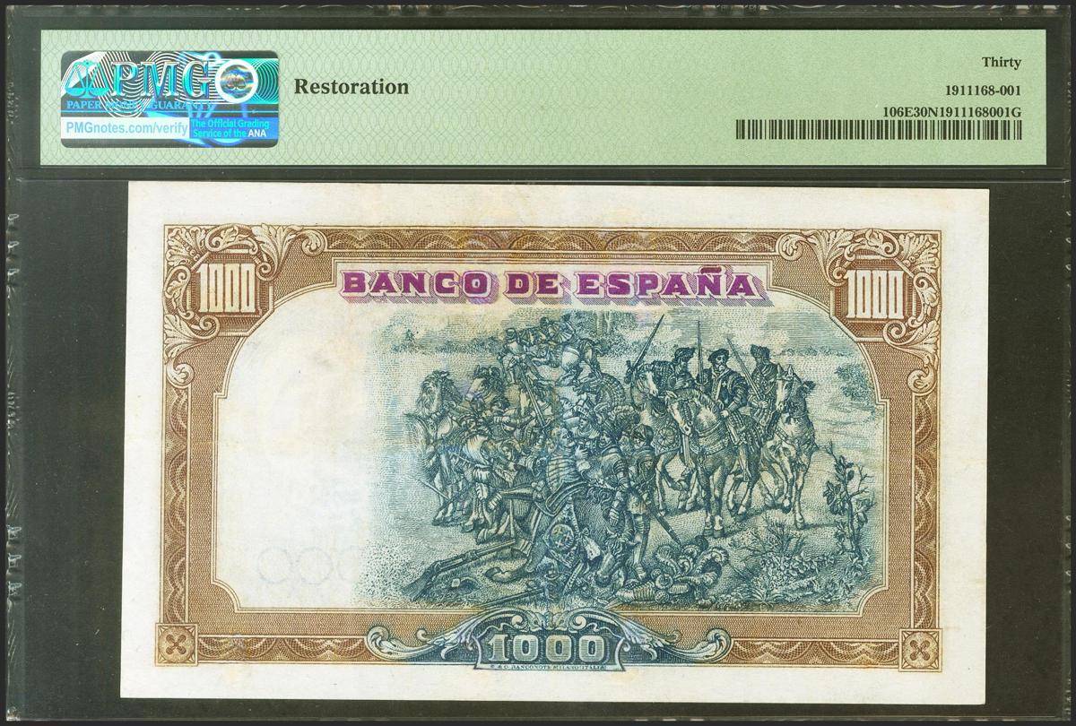 1000 Pesetas. 18 de Julio de 1937. No Emitido y sin numeración. (Edifil: NE44, Pick: 106E). Extremadamente raro, muy pocos ejemplares conocidos, billete de espectacular presencia restaurado profesionalmente, sin duda uno de los billetes más raros del billetario español. MBC. Encapsulado PMG30NET.Luis Auguet, como representante del gobierno de Burgos, estableció las relaciones comerciales entre el bando sublevado y la imprenta italiana Coen de Milán con el objeto de producir una emisión completa de billetes para conmemorar el primer aniversario del alzamiento militar. Debido a las limitaciones formales para poder contactar con las casas inglesas que tradicionalmente venían fabricando billetes para España y por los altos precios del contrato con Giesecke & Devrient, se optó por dar una oportunidad a la casa italiana, a pesar de que no contaba con experiencia en la labor, firmándose el contrato el 1 de Agosto de 1937. Por esos momentos la imprenta contaba con una prensa calcográfica de Serge Beaune, pero que realmente no sabían utilizar; se limitaban a representar a esa casa comercialmente en Italia.Como resultado de esa inexperiencia el proceso de fabricación fue un desastre, produciéndose problemas en los procesos de aprestado y numeración, algo que irritó enormemente a los directivos del Banco de España en Burgos. Coincidió casi en el tiempo la comunicación de los Coen con la noticia que llegó por el SIPM sobre una posible falsificación de billetes de esa emisión no puesta aún en circulación. Así pues, se encontraron a finales de octubre de ese mismo año un billete de 25 pesetas y otro de 1000 pesetas a uno y otro lado de la frontera con Francia. Un mes después se encontró otro ejemplar de 1000 pesetas en Tetuán, con numeración correlativa al hallado en Hendaya.Todo eso era resultado de una mala praxis por parte de Cartevalori en cuanto a la no anulación y destrucción inmediata de billetes defectuosos. A pesar de la seguridad de los carabineros, los robos de papel moneda tuvieron lugar, algo que llevó a largos y duros intercambios por carta y en persona entre las dos partes y cuya disputa se mantuvo durante más de una década.El Banco de España tomó, por ello, la decisión de quemar la remesa que se había recibido de billetes en las calderas de su sucursal de Soria. El ejemplar que se les ofrece en esta subasta es uno proveniente de esa fabricación fallida de 1937. Sin embargo, dada la información disponible, es muy probable que el origen de este billete sea directamente el almacén de Cartevalori, ya que no se observa numeración. Se conocen muy pocos ejemplares de este modelo de billete: uno numerado, un par con sello de inutilizado y otro par más sin él, uno de los cuales parece tener un trazo azul, característico de la anulación de Cartevalori, dato que nos llega por un informe de una visita realizada por personal del Banco de España a la fábrica en 1938, donde se indica que a veces se tachaban y otra no. Además se conocen muy pocas pruebas de color. Este billete tenía originalmente peligrosas faltas de sustrato, por lo que se ha optado por la estabilización del papel, el trabajo realizado es extraordinario.Agradecemos a Jose Antonio Castellanos Vargas su colaboración en la contextualización histórica de esta extraordinaria e histórica pieza de la notafilia española.