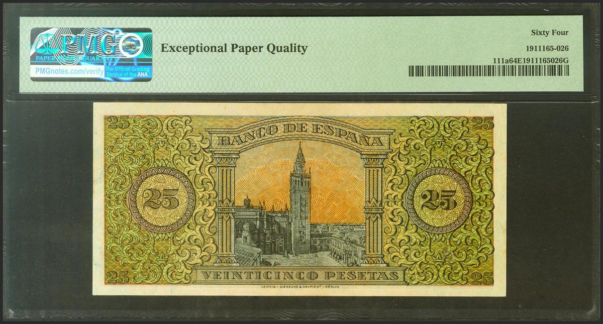 25 Pesetas. 20 de Mayo de 1938. Serie B. (Edifil 2021: 430a, Pick: 110a). Apresto original. SC. Encapsulado PMG64EPQ.