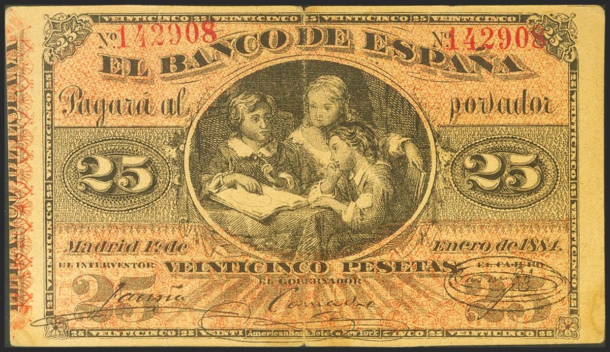 25 Pesetas. 1 de Enero de 1884. Falso de Epoca. Sin serie. (Edifil 2021: 282F). Muy raro e interesante. MBC+.