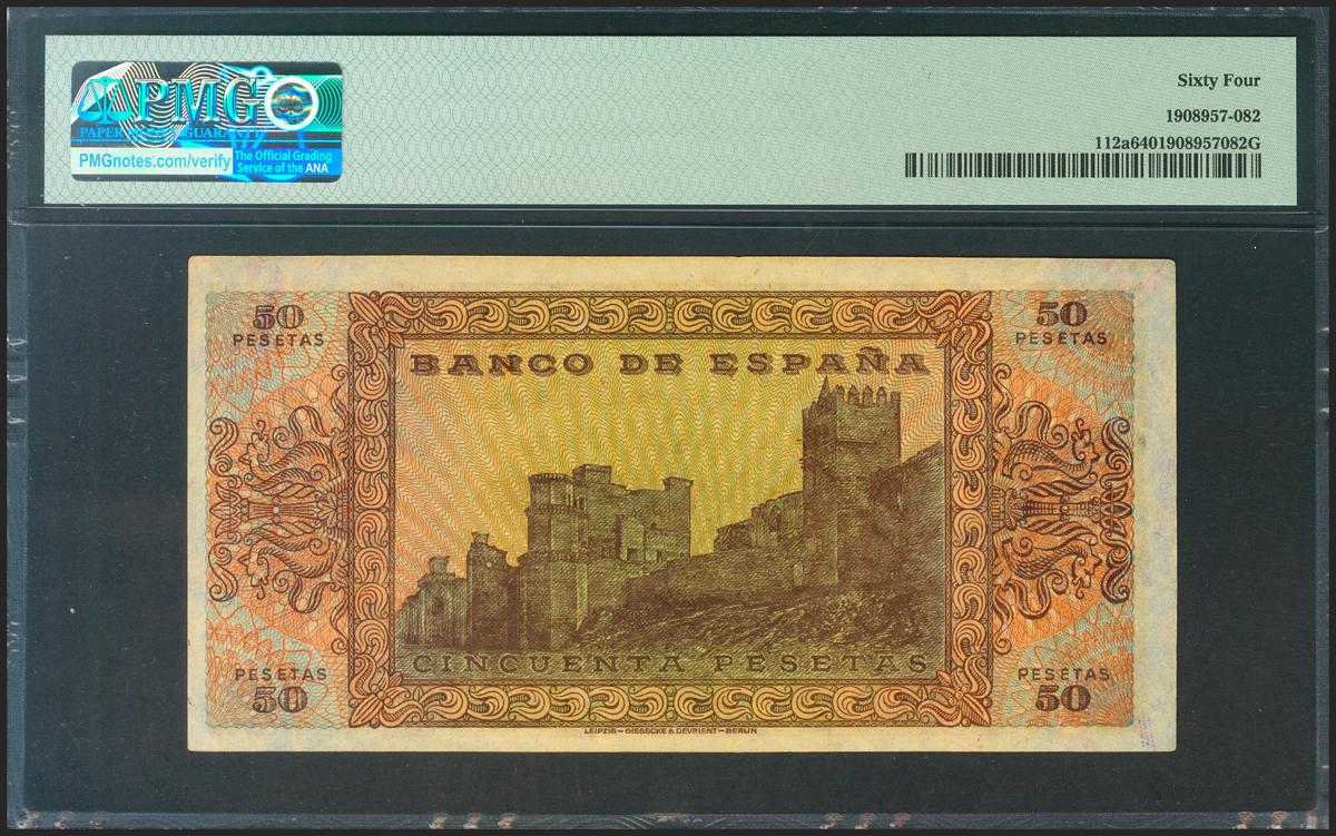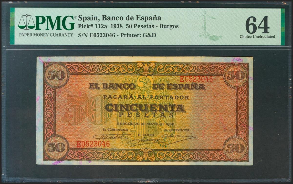 50 Pesetas. 20 de Mayo de 1938. Serie E. (Edifil 2021: 431a, Pick: 112a). Inusual en esta calidad. SC. Encapsulado PMG64.