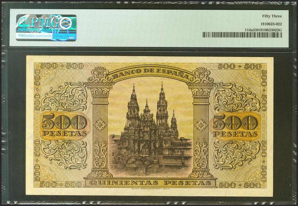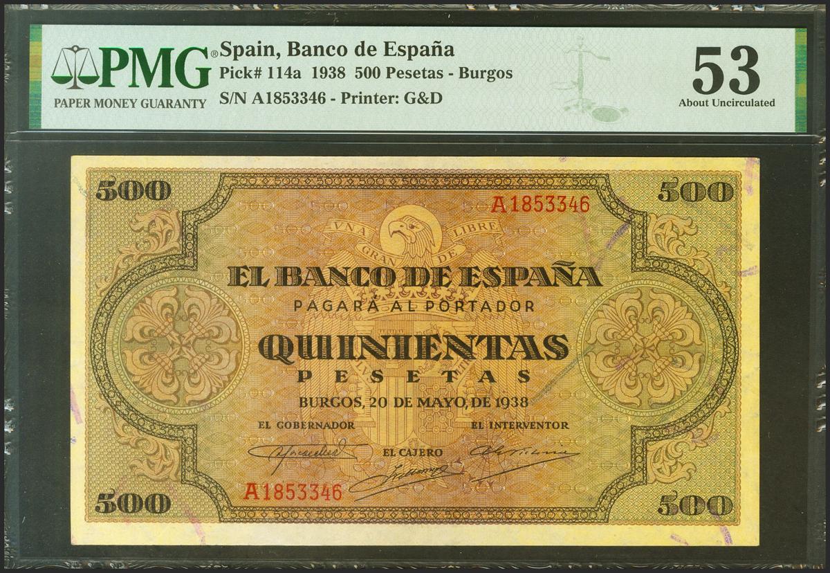 500 Pesetas. 20 de Mayo de 1938. Serie A. (Edifil 2021: 433, Pick: 114a). Inusual. EBC+. Encapsulado PMG53.