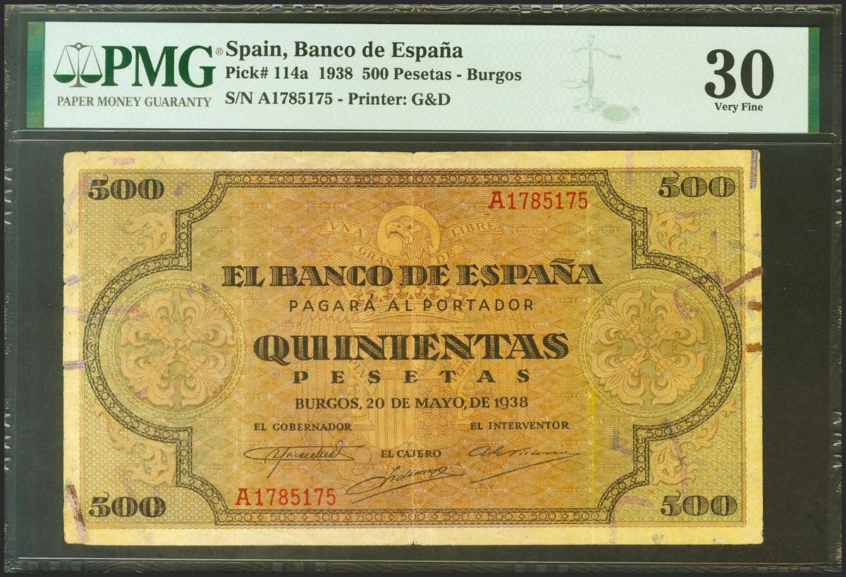 500 Pesetas. 20 de Mayo de 1938. Serie A. (Edifil 2021: 433, Pick: 114a). Mínimamente reparado. MBC. Encapsulado PMG30.