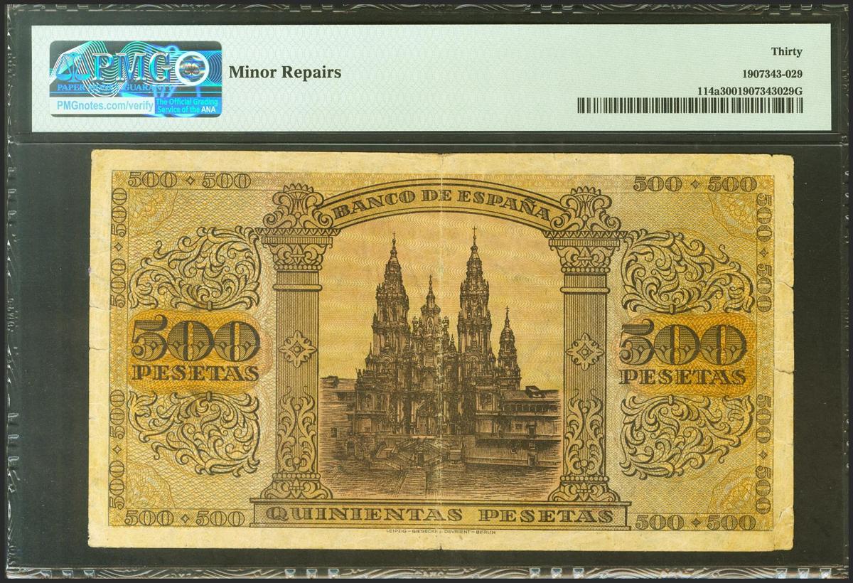 500 Pesetas. 20 de Mayo de 1938. Serie A. (Edifil 2021: 433, Pick: 114a). Mínimamente reparado. MBC. Encapsulado PMG30.