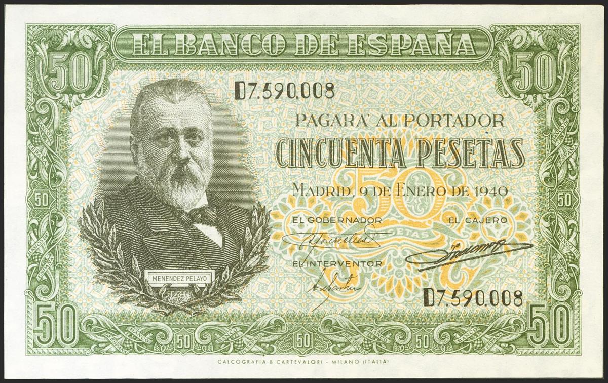 50 Pesetas. 9 de Enero de 1940. Serie D. (Edifil 2021: 437a, Pick: 117a). Raro en esta calidad, apresto original. SC.