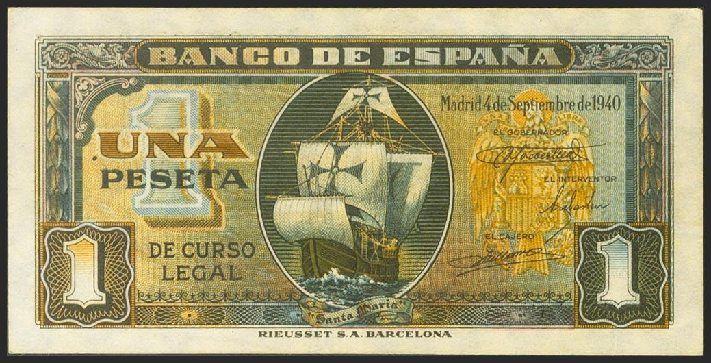 1 Peseta. 4 de Septiembre de 1940. Sin serie. (Edifil 2021: 442). Puntito de aguja, apresto original. SC--.