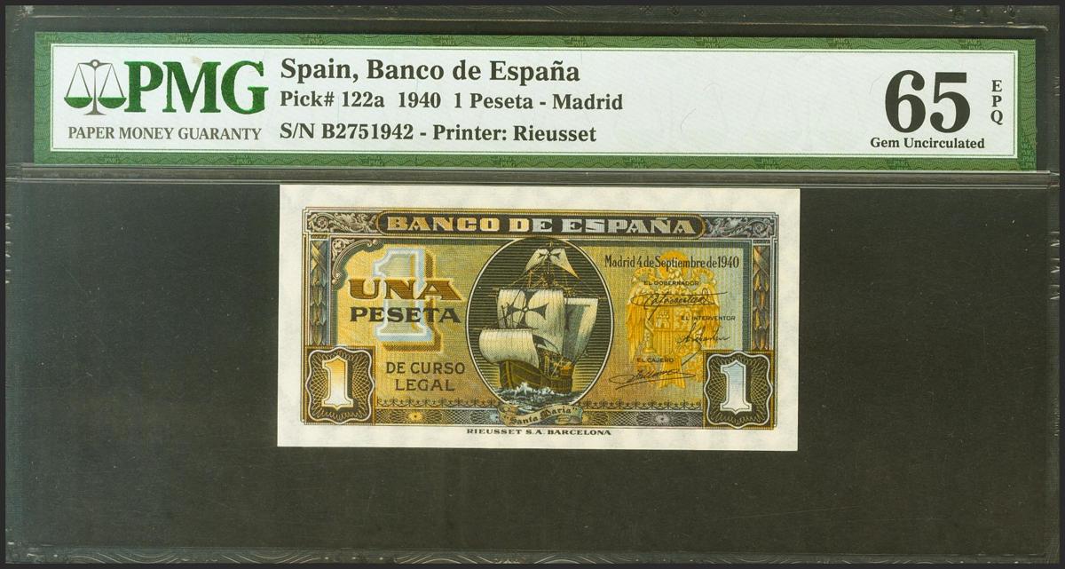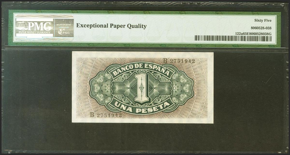 1 Peseta. 4 de Septiembre de 1940. Serie B. (Edifil 2021: 442a, Pick: 122a). Apresto original. SC. Encapsulado PMG65EPQ.