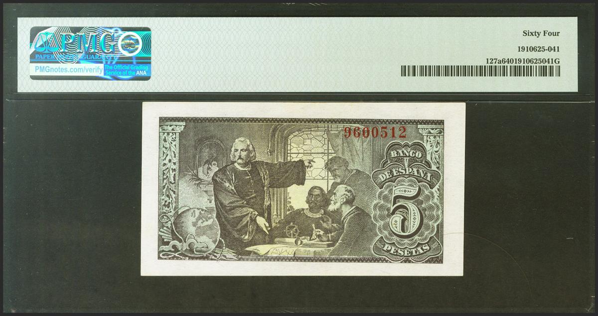 5 Pesetas. 13 de Febrero de 1943. Sin serie. (Edifil 2021: 446, Pick: 127a). Inusual en esta calidad. SC. Encapsulado PMG64.