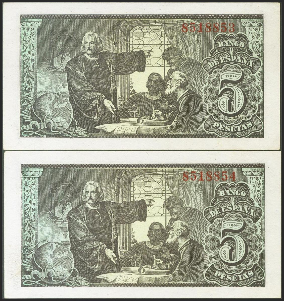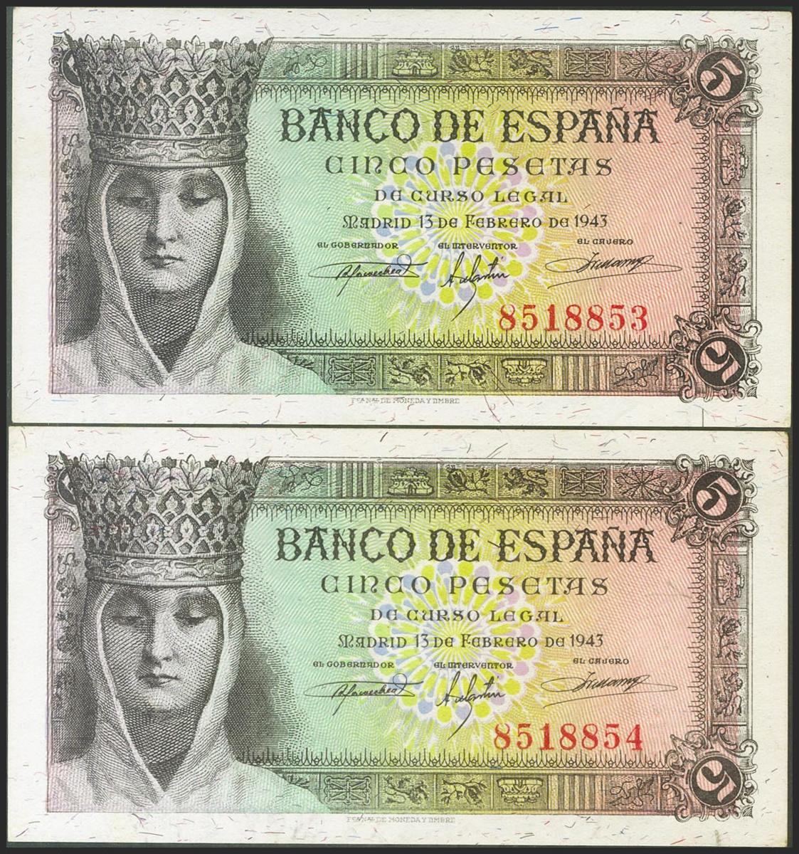 5 Pesetas. 13 de Febrero de 1943. Pareja correlativa. Sin serie. (Edifil 2021: 446, Pick: 127a). Apresto original. SC-.