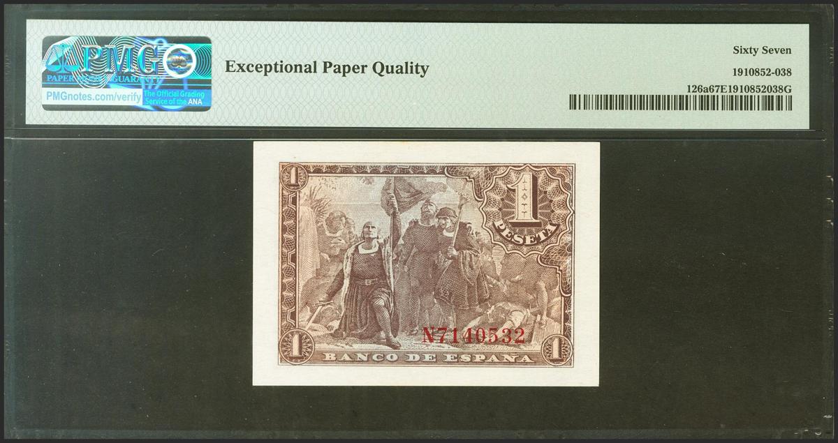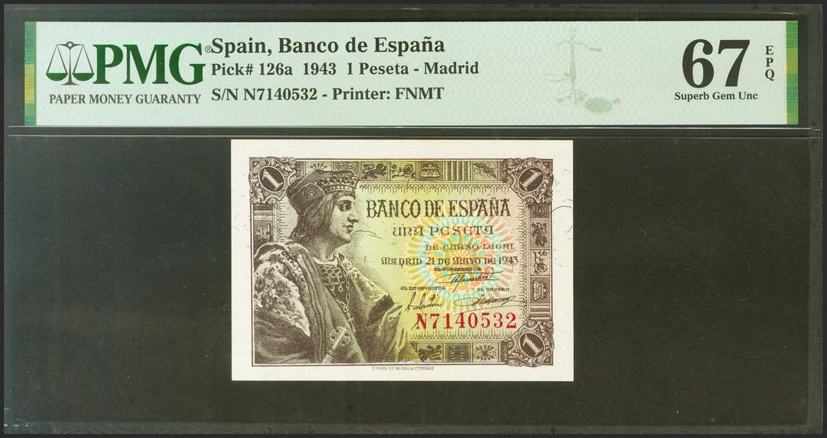1 Peseta. 21 de Mayo de 1943. Serie N, última serie emitida. (Edifil 2021: 447a, Pick: 126a). Apresto original. SC. Encapsulados PMG67EPQ.