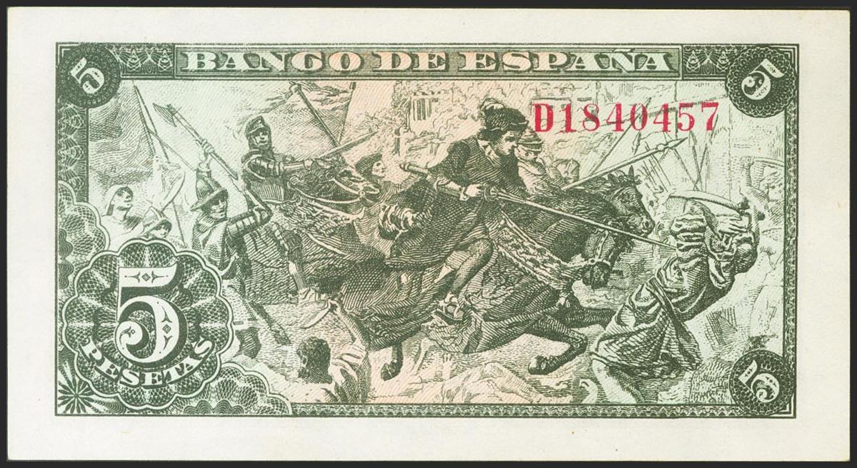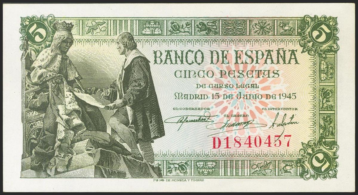 5 Pesetas. 15 de Junio de 1945. Serie D. (Edifil 2021: 449a, Pick: 129a). Raro en esta calidad, apresto original. SC.