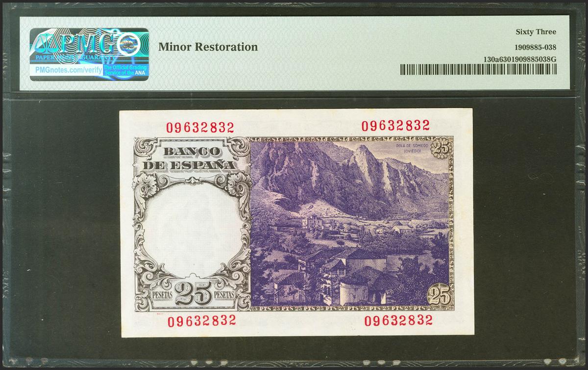 25 Pesetas. 19 de Febrero de 1946. Sin serie. (Edifil 2021: 450, Pick: 130a). Inusual en esta calidad. SC. Encapsulado PMG63.