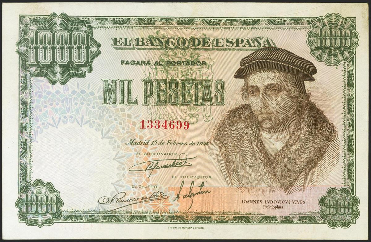 1000 Pesetas. 19 de Febrero de 1946. Sin serie. (Edifil 2021: 453). Conserva parte de su apresto original. EBC.
