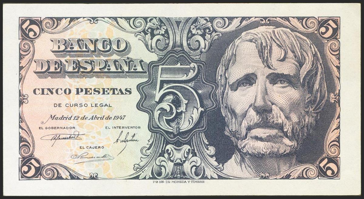 5 Pesetas. 12 de Abril de 1947. Sin serie. (Edifil 2021: 454, Pick: 134a). Conserva gran parte de su apresto original. EBC+.