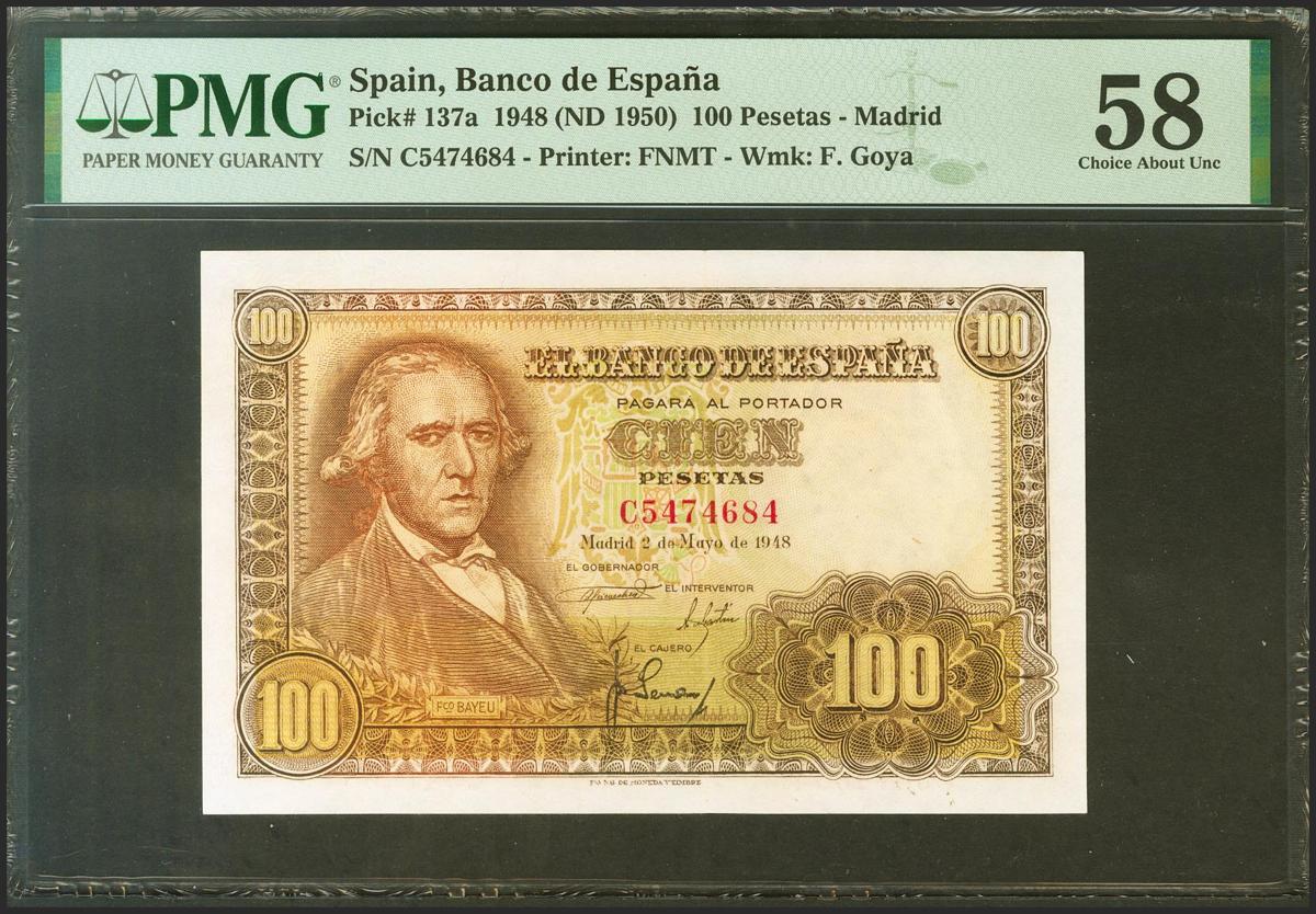 100 Pesetas. 2 de Mayo de 1948. Serie C. (Edifil 2021: 456a, Pick: 137a). EBC++. Encapsulado PMG58.